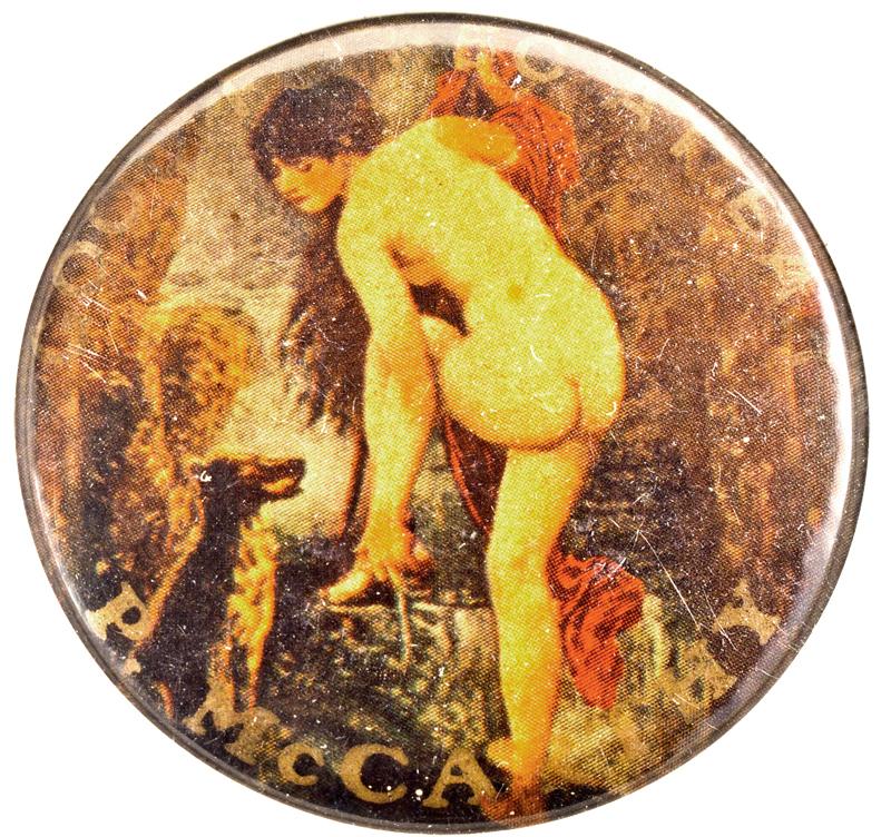 Picture of a nude woman with long hair reaching down at at her left side towards her ankle, while a dog sits watching her. P. McCarthy is printed at bottom. 10c