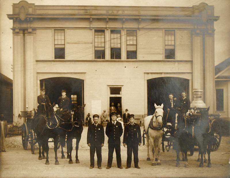 A view of the early SAFD (SA Fire Dept.) with firefighters and horse drawn firefighting wagons in the foreground and the SAFD Station in the background. The photograph measures 8 1/4 x 6 1/4" and is mounted on a brown cardstock measuring 8 1/2 x 6 1/2" (most of the backing around the image has been removed). Contrast is high while the focus is good to sharp. Several black spots are visible on the image near the center of the station house and two small tears are located on the bottom right corner of the image. No photographer is noted. While "SAFD" can easily be discerned at the top of the station, no further information is available to narrow down the city of origin of the photograph, nor are any notes provided on the reverse. The seven firefighters pictured are likely wearing "dress" uniforms that include jackets, ties and hats. Both of the horse drawn wagons have two firefighters on board, while one appears to be a hook and ladder company and the other appears to be a hose company.