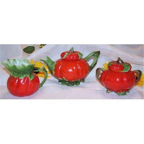 * this darling and incredibly designed Tea Set comes to you in the highly collected tomato pattern and features a realistic tomato body in rich red, highlighted by a stunningly realistic leaf finial - the set is miniature or individual in size and hails from the experts of house of Royal Bayreuth