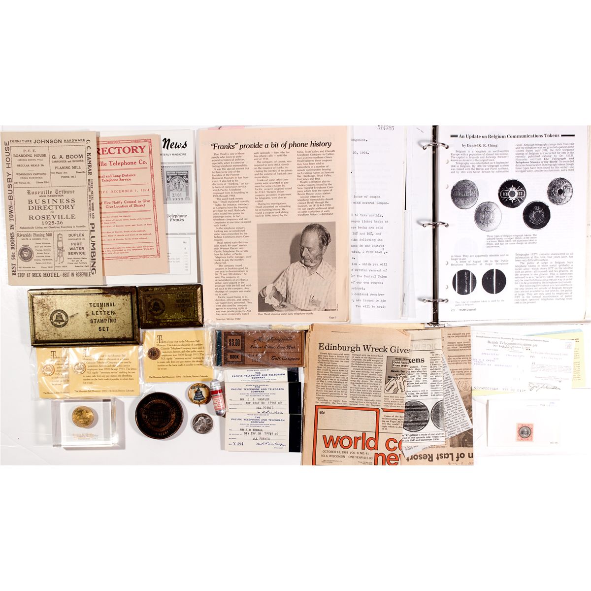 Includes company business letters, Terminal numeral stamping sets, telephone newspaper clippings, telephone produced sewing kit, business cards, anniversary medal, token, pin, token and a telephone company ribbon from the 1952 Republican national convention. Some wear. - Weber Collection