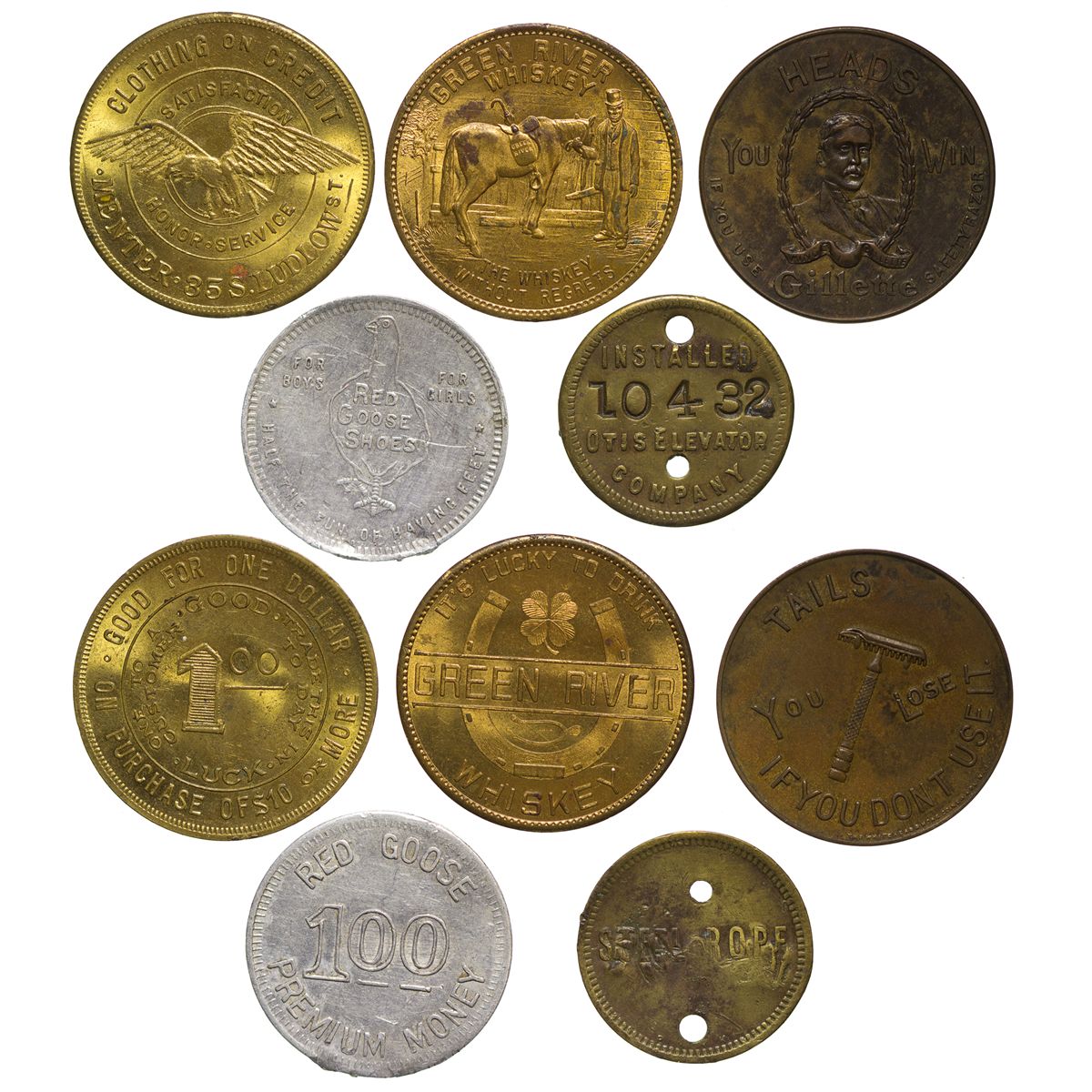 Lot of 5. Gillette Razor "HEADS" TAILS". Menter Clothing "$1.00" Credit token; Green River Whiskey; Red Goose Shoes "$1.00" token; Otis Elevator Co. "INSTALLED 10432" brass tag. - Weber Collection