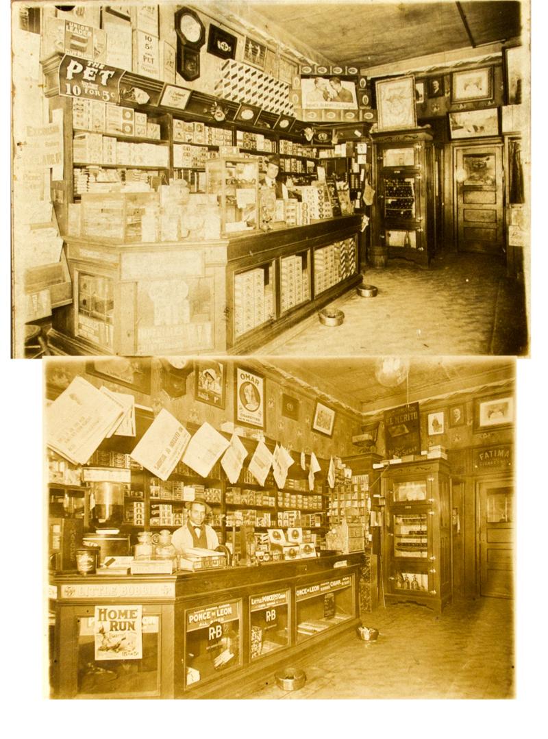 Lot of 2 photographs of the same store at different times. A) Heavily stocked tobacco store with advertising all over the walls, including Omar Cigarettes, El Merito Cigars, Fatima Cigarettes, Ponce de Leon Cigars, Camel, Homerun Cigarettes and Little Bobbie Cigars. Vendor was selling what appears to be bottles liquor in the corner of the store. 5" X 7" on 7" X 9" board, which is damaged on right edge. Medium focus and contrast. B) Exact same interior and view, probably under different owner ship or management and perhaps several years later. The spittoons are even the same, but none of the advertising is the same. The clock, bar, floor ceiling, door, vent, molding, etc. Are all the same. Focus and contrast are fair. Matte is damaged. Same size as other.