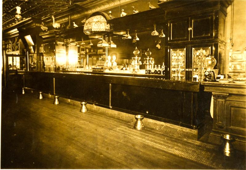 Very fancy expensive and long bar. Has a large stained glass canopy at the center of the bar. Gumball machine appears at right. Glass and stained glass doors for the wine cabinet in the back bar. Stained glass lamps throughout. Spittoons on floor. Measures approximately 5" X 7" on a 8" X 10" board. Excellent condition, focus and contrast.