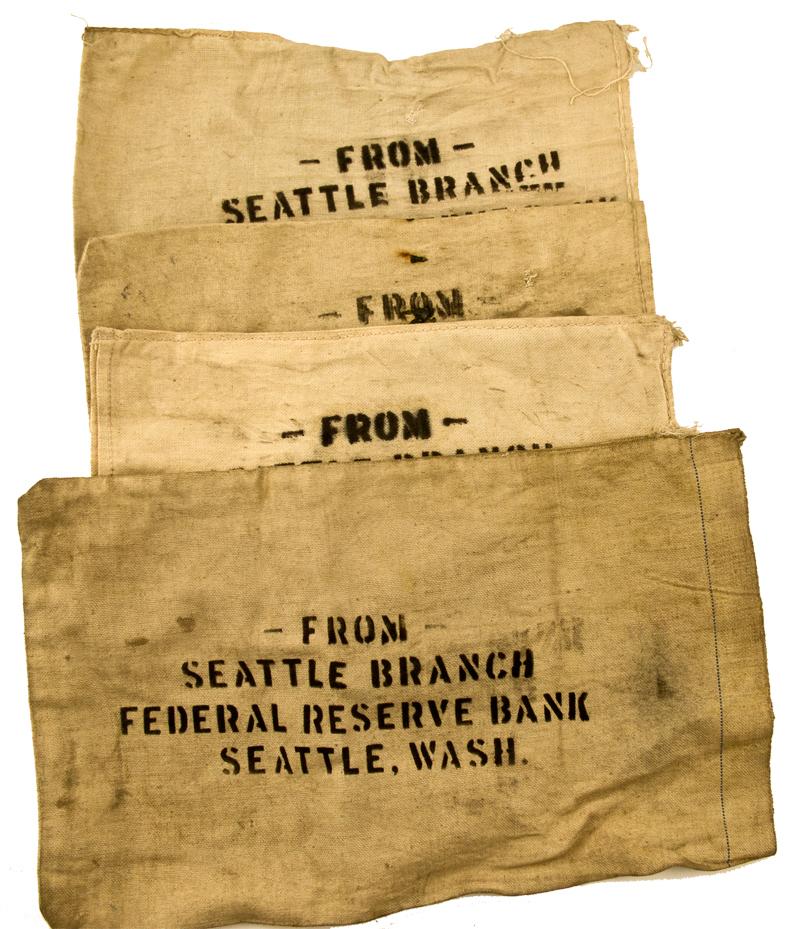 Lot of four early bags used for gold, silver and copper coin. All are marked "From Seattle Branch Federal Reserve Bank Seattle, Wash." One bag clearly carries US $20 gold coin impressions and is so noted in the group. Generally fine.