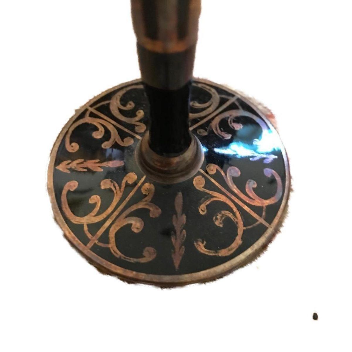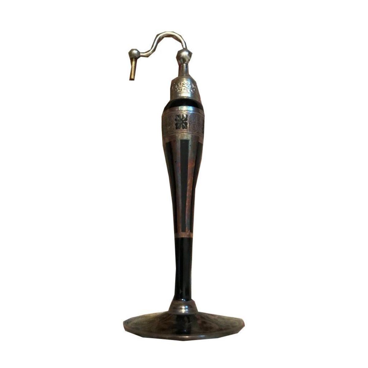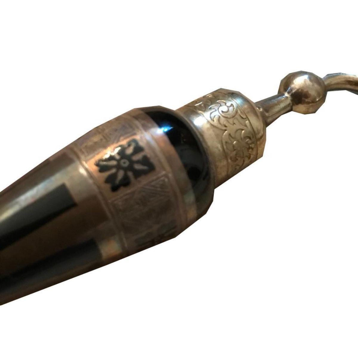 Lovely ebony DeVilbiss perfume atomizer with ornate silver overlay. The glass made by the Cambridge Glass Company & fittings provided by the DeVilbiss Company, which also marketed all their perfumes. Produced in the early to mid- 1920s, this elegant atomizer measures 6.5" in height. It can be found in the DeVilbiss catalogs from 1923/24 and 1925 as item number L-8. * will need a replacement hose & squeeze bulb. 7" H.