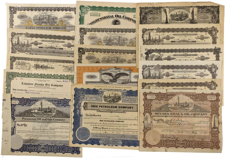 Lot of 44. Group of various oil company stocks. Three are unused. A few of them are: 1)Golden State Oil Company. Dated Jan. 29, 1923. No. 551 certified that C.H. Duborg owned 1,000 shares. Endorsed by C.U. Fryer as secretary and Geo. W. Wilson as president. Also endorsed on the reverse. Good. 2) The Black Rock Oil, Gas, Refining and Developing Company. Dated Sept. 24, 1921. Incorporated in Nevada.  Dated June 23, 1920. No. 377 issued to Maggie Lindersmith by J.C. Rancher as secretary and Geo. N. Peltier as president for 1,000 shares. Endorsed on the reverse. Good. 3) An unused Income Royalties Trust: Certificate of Beneficial Interest. No 144. Excellent condition. 4) Coaldale Merger Oil Company. Incorporated in Nevada April, 1924. Dated Nov. 12, 1925. No. 3799 issued to Ralph Wardle for 1,000 shares by Paul Taylor (sp?) as president and W.N. Richardson as secretary. Great condition. 5) Pacific Undersea Oil, Inc., incorporated in Nevada on Sept. 21, 1938. Dated Oct 26 1950.  No. 931 issued to Bernice Catherin Webster for 1,000 shares by the secretary and president - both signatures are illegible. Signed on the reverse by Webster. Excellent condition. These 5 are just a sample of what this lot of 44 contains.