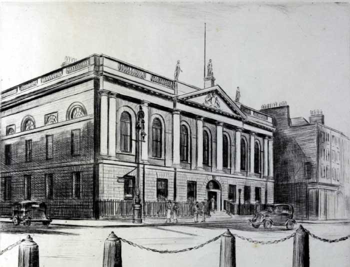 Etching of the Royal College of Surgeons, garrison of the Irish Citizen Army under Commandant Michael Mallin and his second in command, Countess Markievicz during the 1916 Rising. By E. J. Rogers, who exhibited regularly at the RHA from an address in Rathgar. Two of his etchings are in the National Library of Ireland.