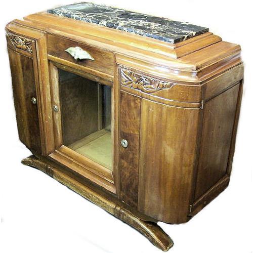 This French Art Deco sideboard dates from the 1930s. Measures 42.5" high by 55" long by 18" deep. Recently imported from Paris. Color is a light golden brown as seen in our last two images. Our first two images are dark and shifted heavily toward red and do not reflect the color of the finish. It features a dark marble top with streaks of creamy white. Hand-carved fruit and foliage designs decorate the left and right front panels, and in the center is a drawer with golden pull depicting a bird in flight. Figured walnut decorates the front doors, and a glass-enclosed showcase resides in the center. Showcase houses its original silvered mirror, which is in poor condition and which could be replaced easily and inexpensively. Overall condition is fair, with lots of nicks and scratches to the finish, consistent with its age. Thanks for visiting, and please feel free to contact us with any comments or questions.