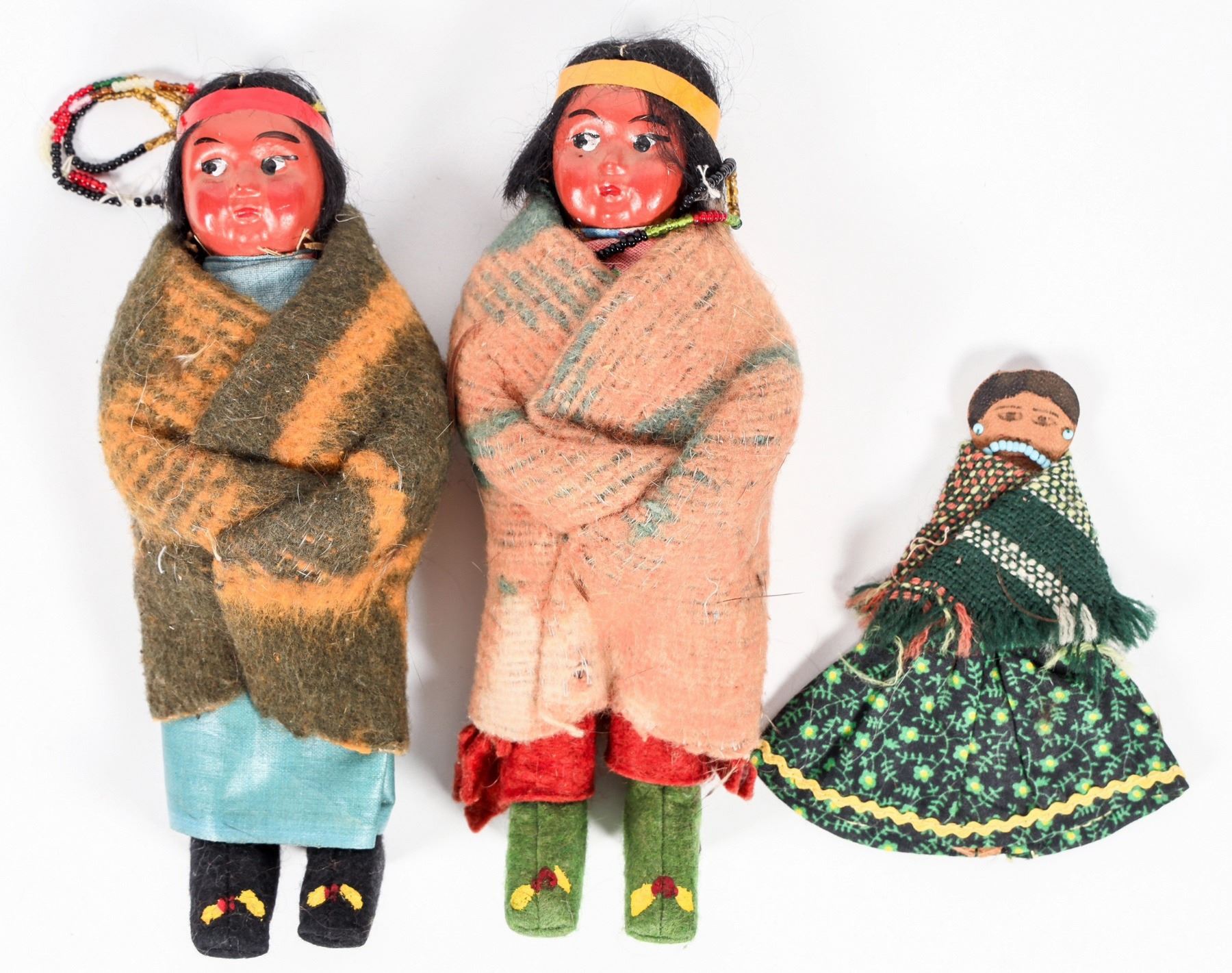 Native American dolls, c1940. Both 3d dolls are about 7.5" tall and do not balance easily. Fabric doll, appearing to be made of leather, measures 4.5" tall. Good condition with small imperfections in the paint. See photo.