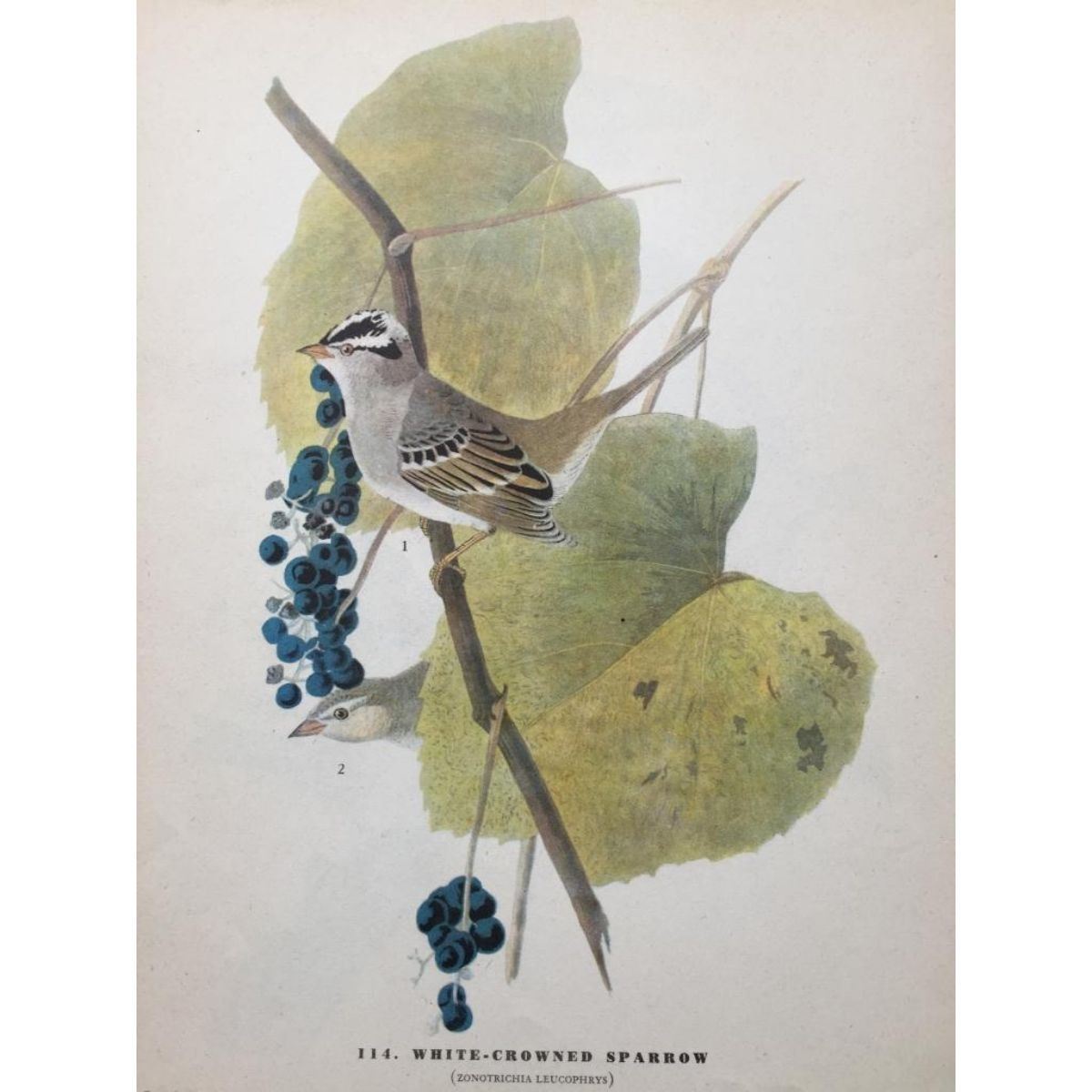 John James Audubon book plate print, from a 1946 edition of "The Birds Of America." # 114 White-Crowned Sparrow. 8 1/2" X 11 1/2". Comes with 11"x14" mat.
