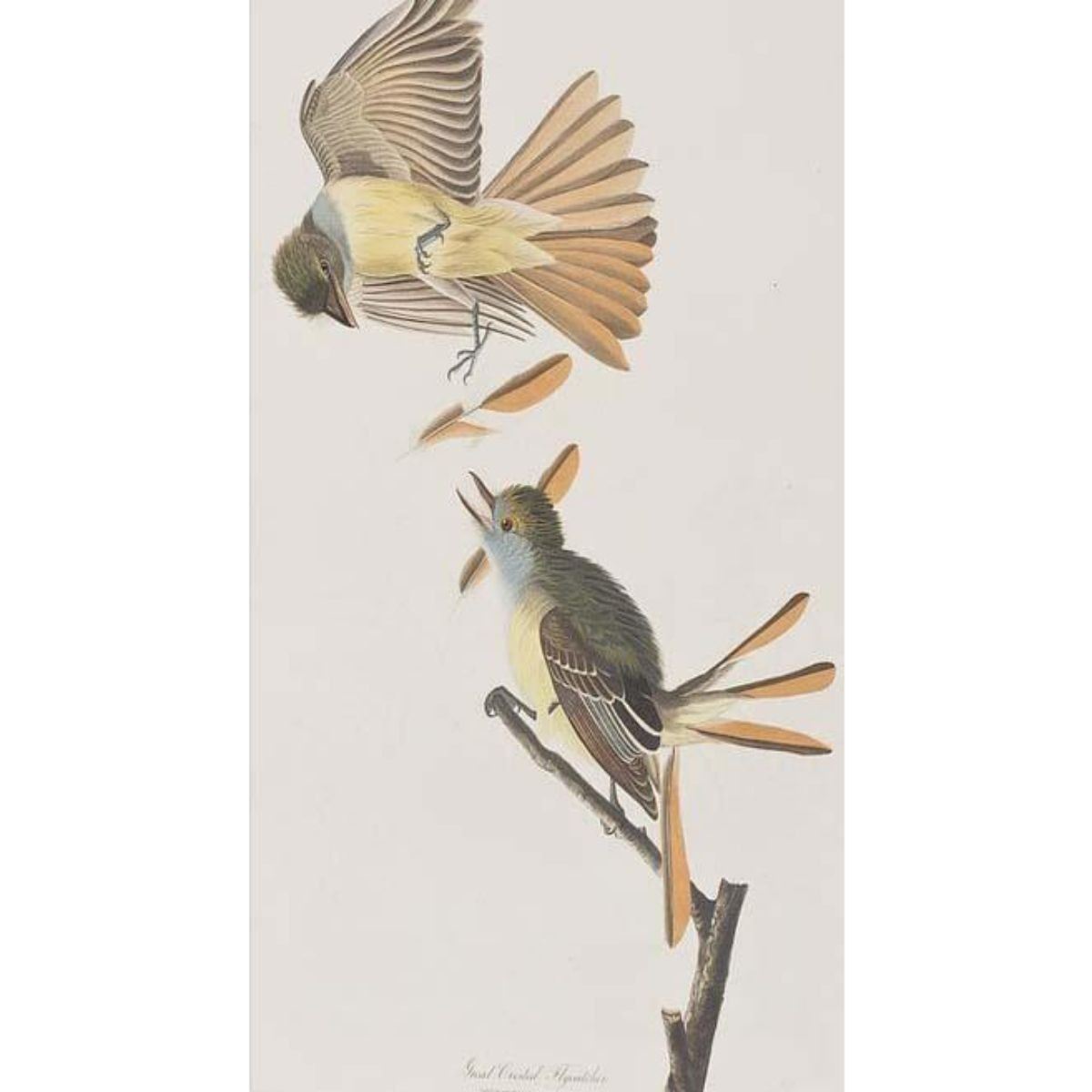 John James Audubon, book plate print, # 129 Crested Flycatcher, taken from a 1946 edition of "The Birds Of America". 8 1/2" X 11 1/2". Comes with 11" X 14" mat. Â