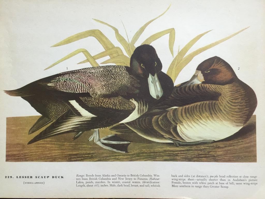 Lesser Scaup Duck print # 229 from a 1946 edition of The Birds Of American by John James Audubon. 8 1/2" X 11 1/2". Comes with 11" X 14" mat. * dog ear bend to the bottom right corner that will not affect framing.