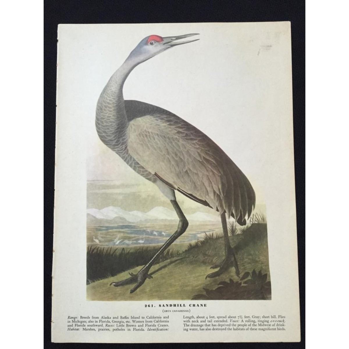 John James Audubon, book plate print, # 261 Sandhill Crane, taken from a 1946 edition of "The Birds Of America." 8 1/2" X 11 1/2". Comes with 11" X 14" mat.