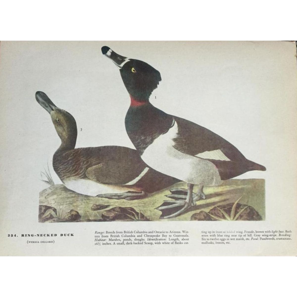 John James Audubon book plate print #234 or #294 Ring-Necked Duck, from a 1946 edition of The Birds Of America. 8 1/2" X 11". Comes with 11" X 14" mat.