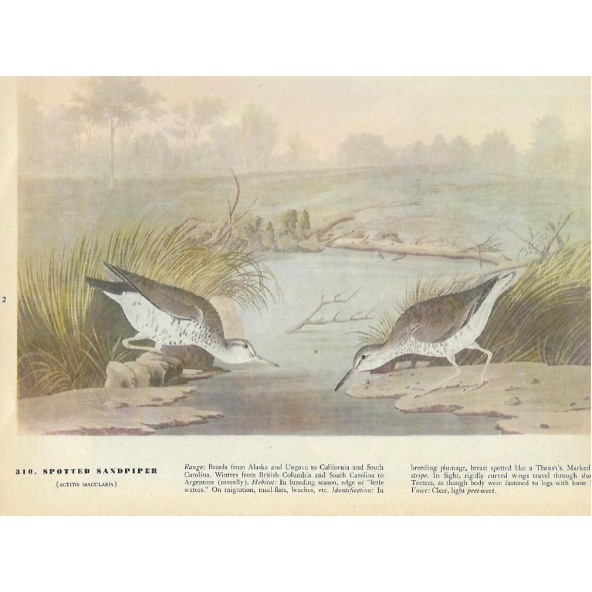 John James Audubon, book plate print, #310 Spotted Sandpiper, taken from a 1946 edition of "The Birds Of America". 8 1/2" X 11 1/2". Comes with 11" X 14" mat.