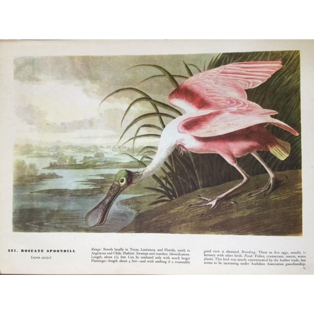 John James Audubon, book plate print, from a 1946 edition of The Birds Of America. # 321 Roseate Spoonbill. 6 1/2" X 10 1/2" image size on 8 1/2" X 11 1/2" page. Comes with 11" X 14" mat.