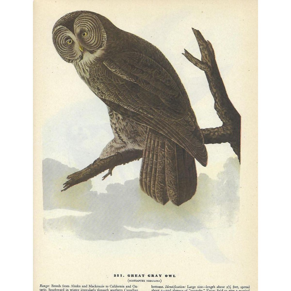 John James Audubon, book plate print, # 351 Great Gray Owl, taken from a 1946 edition of "The Birds Of America". 8 1/2" X 11 1/2". Comes with 11" X 14" mat. Â
