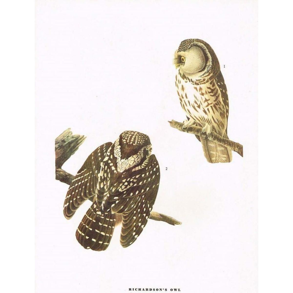 John James Audubon, book plate print, # 380 Richardson's Owl, taken from a 1946 edition of "The Birds Of America". 8 1/2" X 11 1/2". Comes with 11" X 14" mat. Â