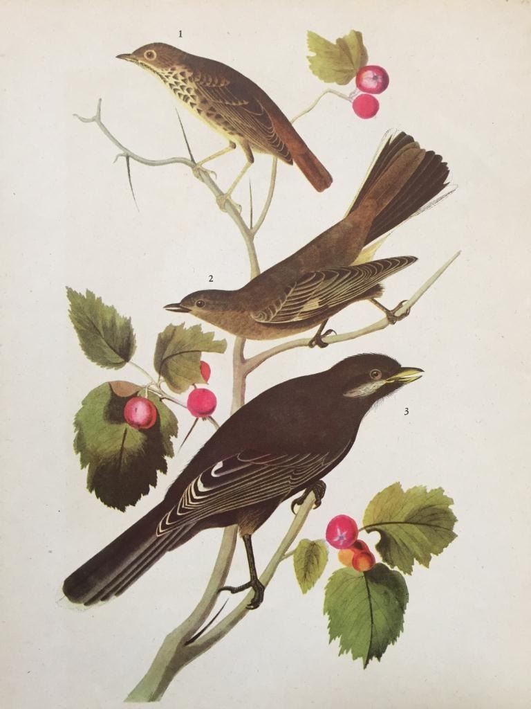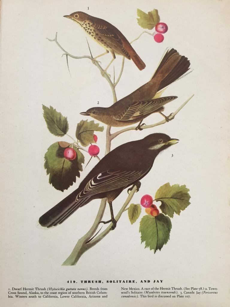 John James Audubon book plate print, from a 1946 edition of "The Birds of America." # 419 Thrush, Solitaire, And Jay. 9" X 11". Comes with 11" X 14" mat.