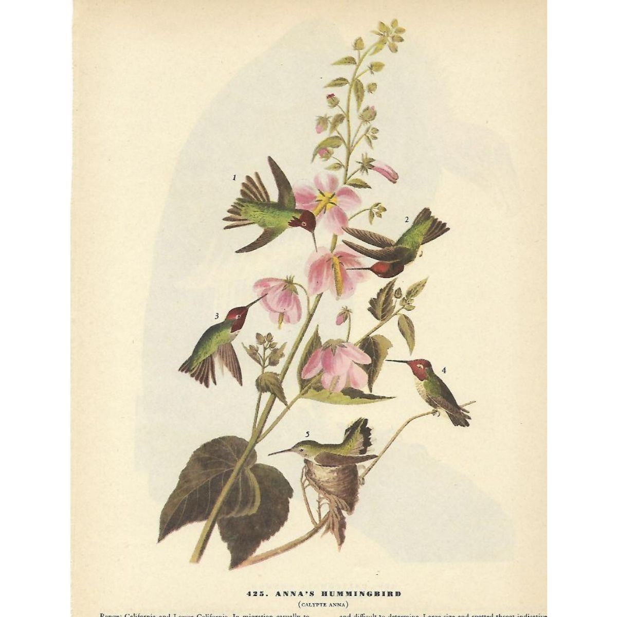 John James Audubon, book plate print, # 425 Anna's Hummingbird, taken from a 1946 edition of "The Birds Of America." 8 1/2" X 11". Comes with 11" X 14" mat.