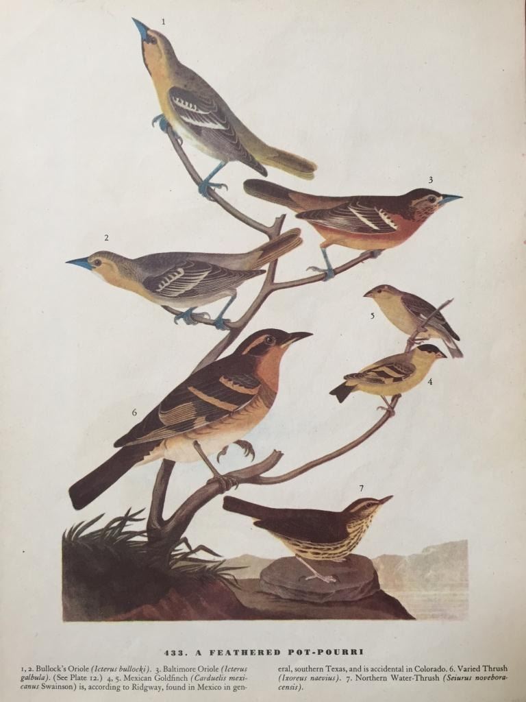 John James Audubon book plate print, from a 1946 edition of "The Birds Of America." # 433 A Feathered Pot-Pourri. Bullock's Oriole, Baltimore Oriole, Mexican Goldfinch, Varied Thrush & Northern Water Thrush. 9" X 11"Comes with mat.