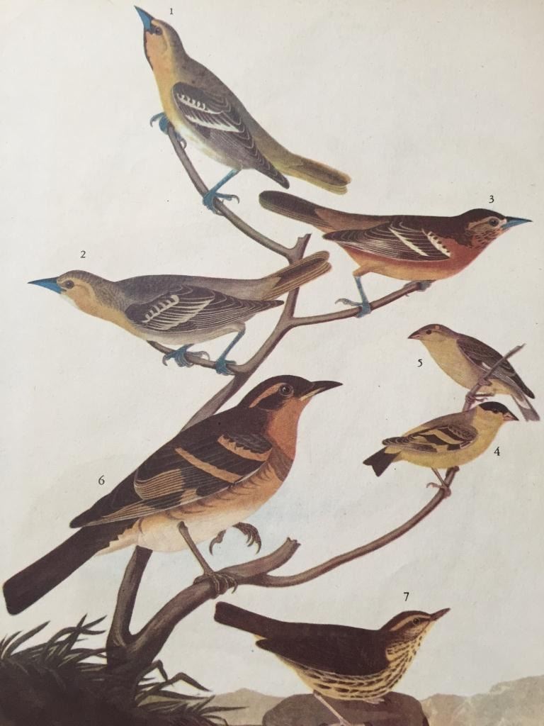 John James Audubon book plate print, from a 1946 edition of "The Birds Of America." # 433 A Feathered Pot-Pourri. Bullock's Oriole, Baltimore Oriole, Mexican Goldfinch, Varied Thrush & Northern Water Thrush. 9" X 11"Comes with mat.