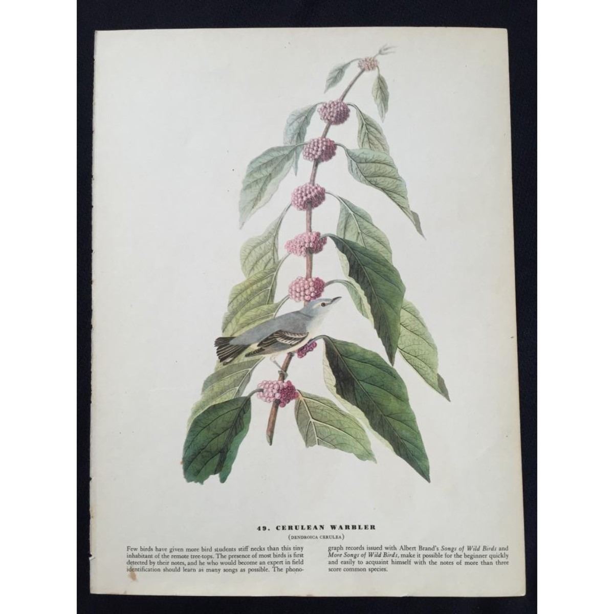 John James Audubon, book plate print, # 49 Cerulean Warbler, taken from a 1946 edition of "The Birds Of America." 8 1/2" X 11 1/2" print size. Comes with 11" X 14" mat.