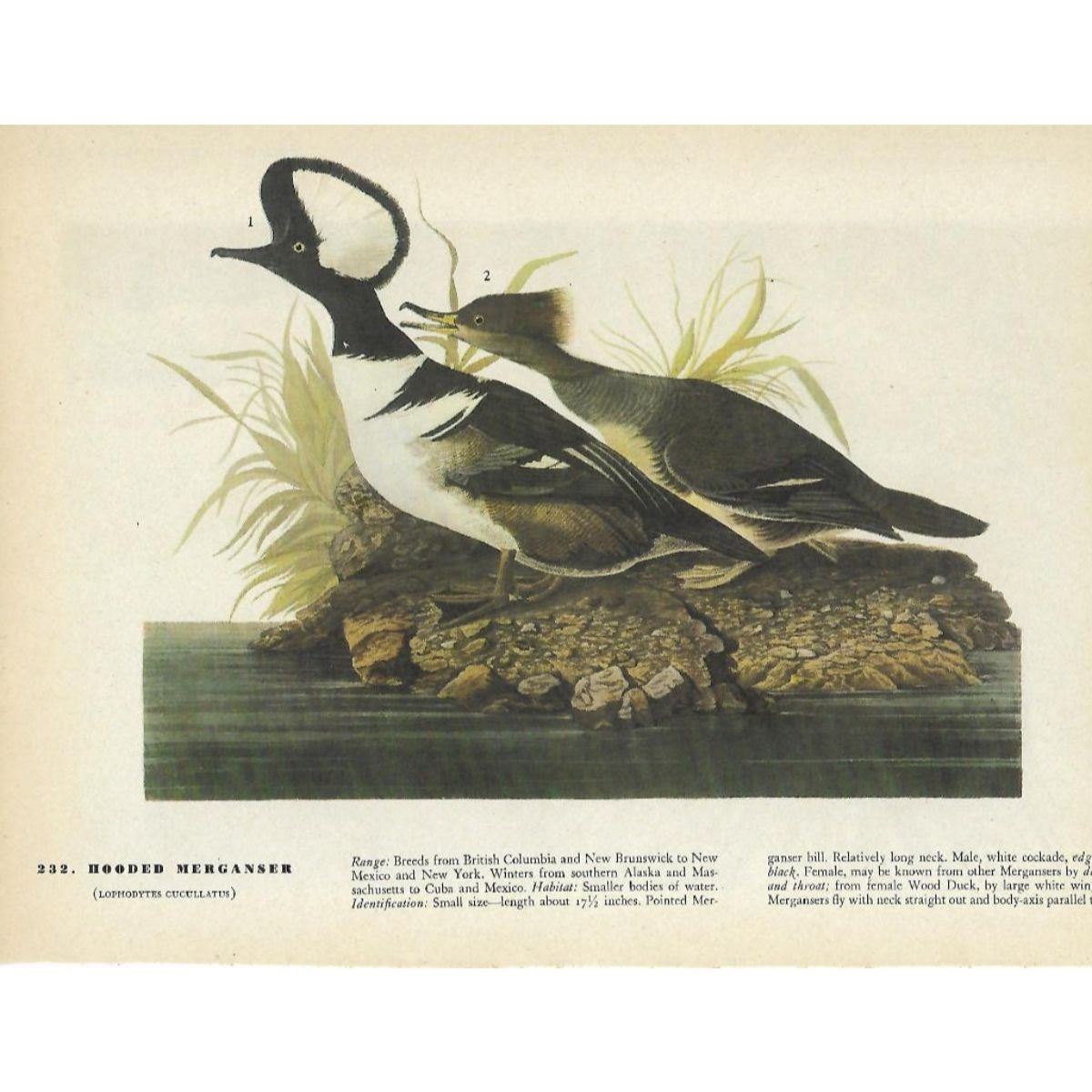 John James Audubon, book plate print, # 232 Hooded Merganser, taken from a 1946 edition of "The Birds Of America." 8 1/2" X 11". Comes with 11" X 14" mat.