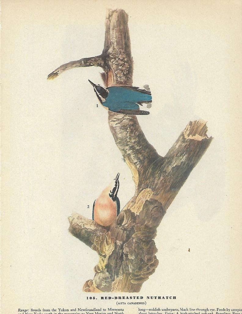 John James Audubon, book plate print, # 105 Red-Breasted Nuthatch, taken from a 1946 edition of "The Birds Of America." 8 1/2" X 11". Comes with 11" X 14" mat.
