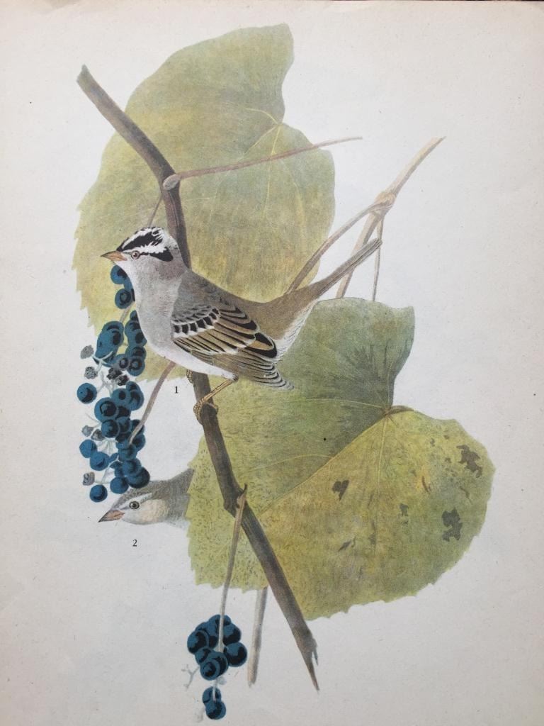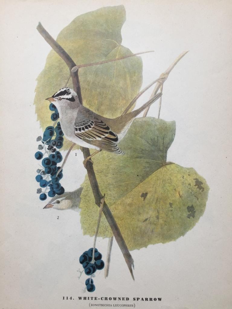 John James Audubon book plate print, from a 1946 edition of "The Birds Of America." # 114 White-Crowned Sparrow. 8 1/2" X 11 1/2". Comes with mat.
