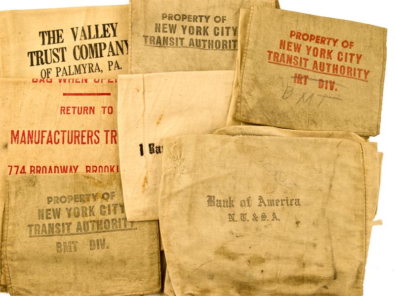 Lot of 23 bags. California Bank, Los Angeles (2); Bank of America (5); First National Bank of Boston; First Western Bank and Trust; New York City Transit Authority (3); Farmers and Citizen Bank, Trotwood, OH; Manufacturers Trust, Brooklyn; The Valley Trust Company, Palmyra, PA; New York Telephone Company (2); Girard Trust Corn Exchange; First Pennsylvania Banking and Trust; Hamilton Manufacturing (4); Lawrence Buckshot (2). All in relatively good condition.