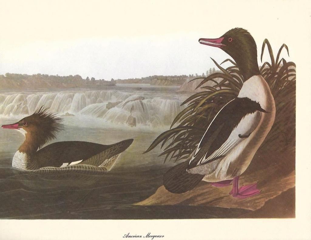 c.1950 Audubon print, American Merganser - vintage print, from the collection, "Audubon - Fifty Selections with Commentaries by Roger Tory Peterson". 9" X 12" print size. Comes with 11" X 14" mat board.Â