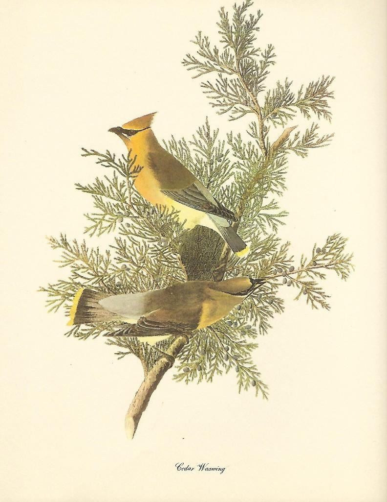 c1950 Audubon print, Cedar Waxwing - vintage print, from the collection, " Audubon - Fifty Selections With Commentaries by Roger Tory Peterson". 9" X 12" print size. Comes with 11" X 14" mat board.