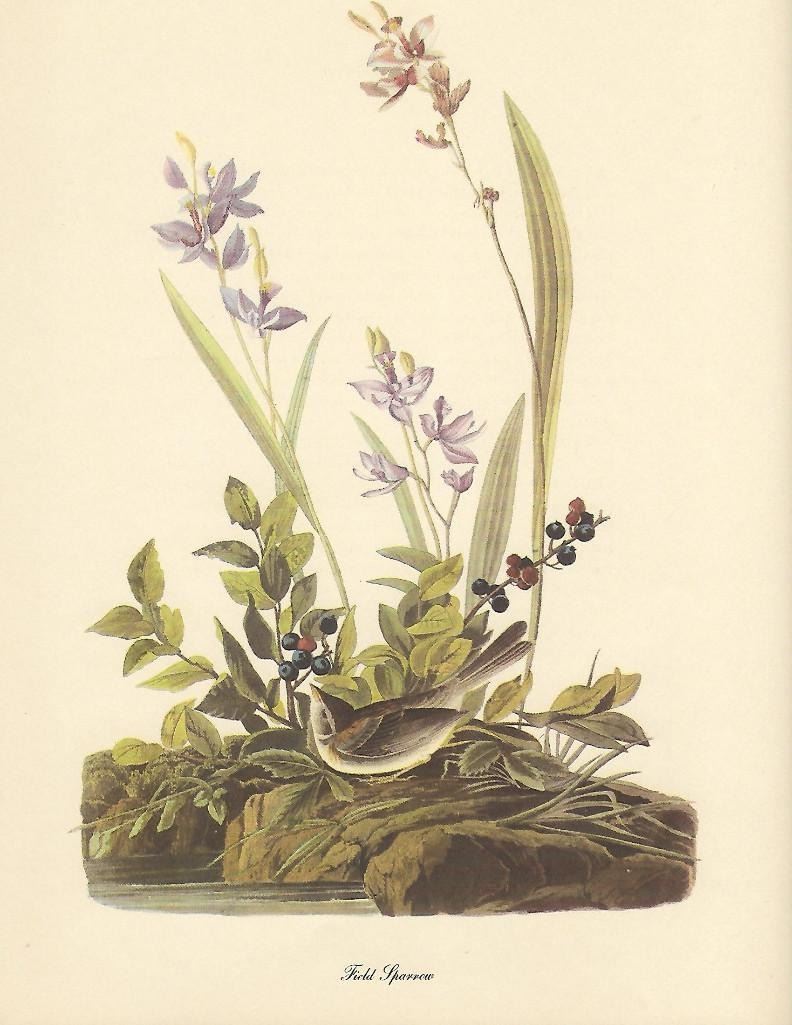 c1950 Audubon print, Field Sparrow - vintage print, from the collection, " Audubon - Fifty Selections With Commentaries by Roger Tory Peterson". 9" X 12" print size. Comes with 11" X 14" mat board.