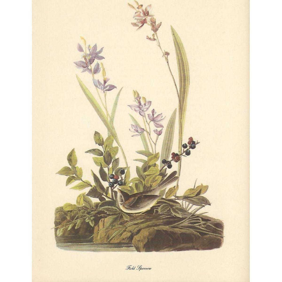 c1950 Audubon print, Field Sparrow - vintage print, from the collection, " Audubon - Fifty Selections With Commentaries by Roger Tory Peterson". 9" X 12" print size. Comes with 11" X 14" mat board.