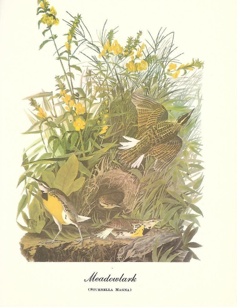 c1950 Audubon print, Meadowlark - vintage print, from the collection, " Audubon - Fifty Selections With Commentaries by Roger Tory Peterson". 9" X 12" print size. Comes with 11" X 14" mat board.