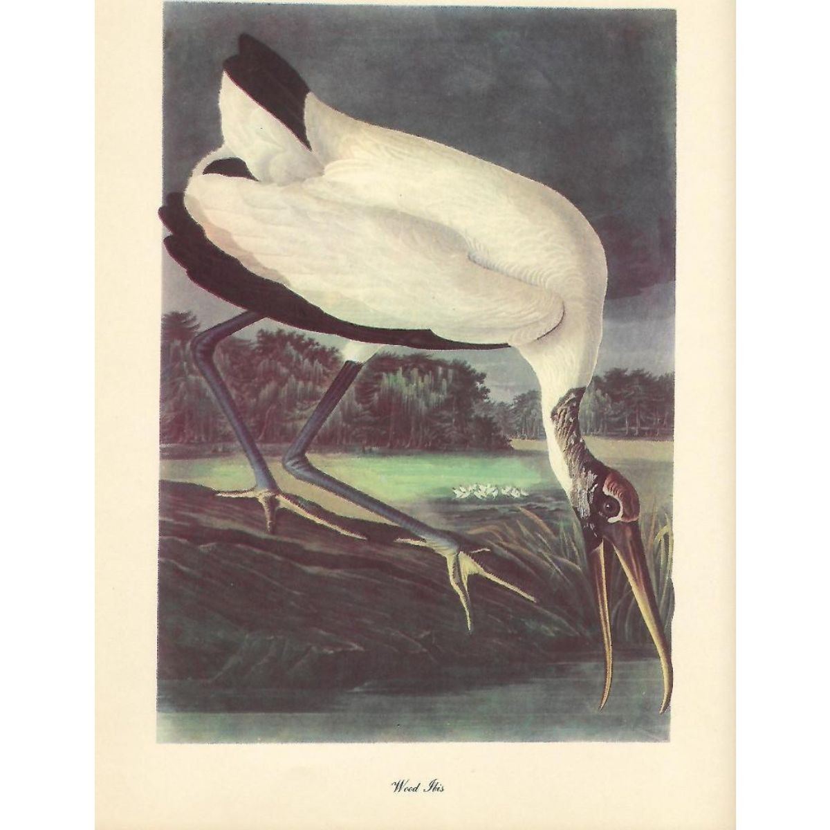 c1950 Audubon print, Wood Ibis - vintage print, from the collection, " Audubon - Fifty Selections With Commentaries by Roger Tory Peterson". 9" X 12" print size. Comes with 11" X 14" mat board.