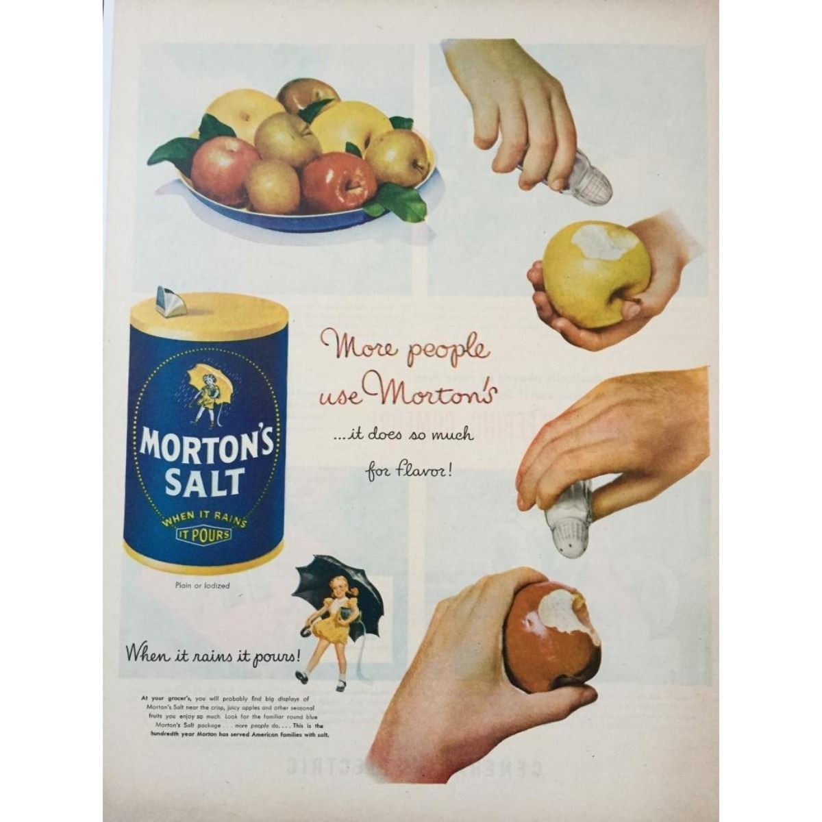 Original c1950 magazine ad for Morton's Salt. Slogan reads, " More people use Morton's...it does so much for flavor!". Features fruit bowl & hands sprinkling salt over fruit. 10" X 14" mounted on archivallinen for preservation.