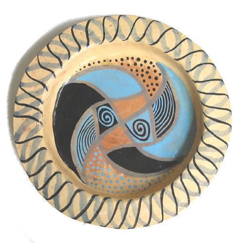 This hand-painted earthenware decorative plate was purchased in London in the late 1960s. Artist is unknown. There are markings on the rear which appear to read " FLSG " and an inscribed mark (possibly the artist's mark) toward the top which has not been deciphered. Measures 13" in diameter and 2" deep, and weighs 4 lbs. Style is reminiscient of Pablo Picasso's ceramic plates.
