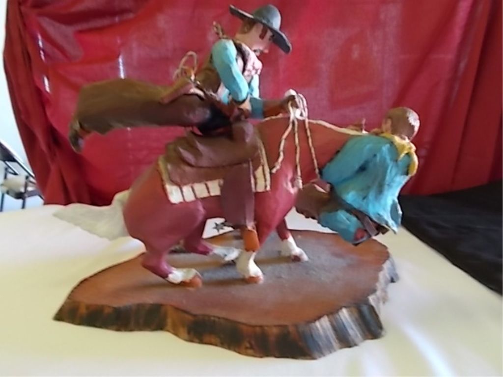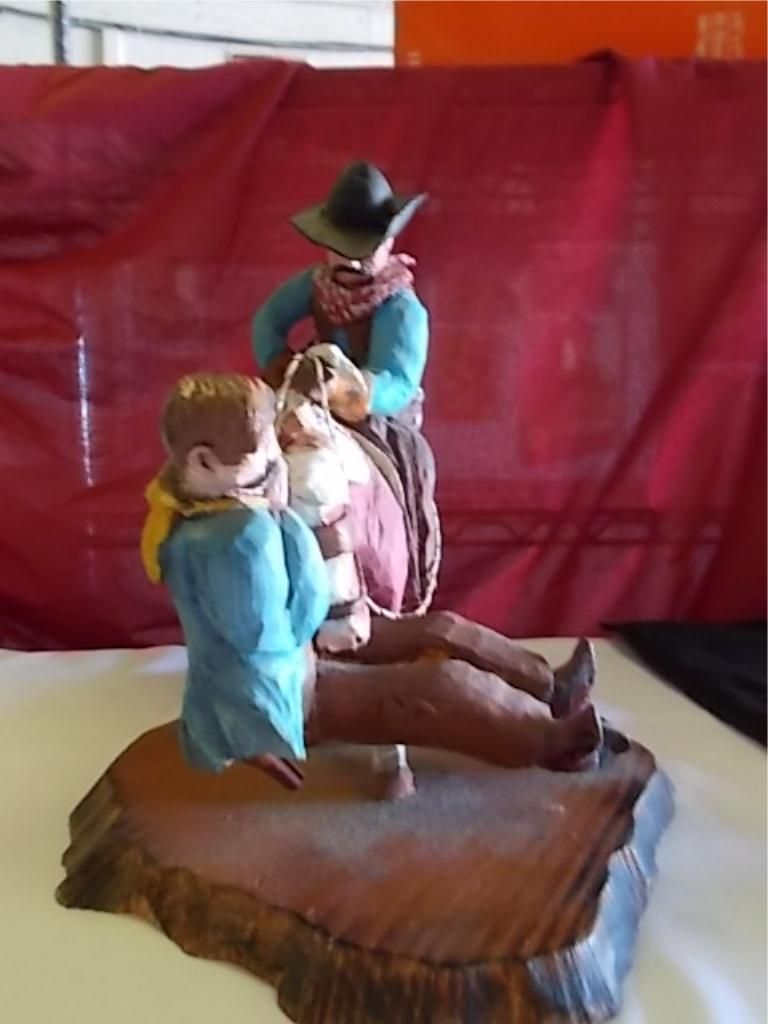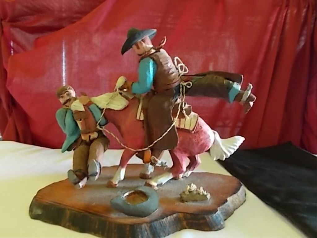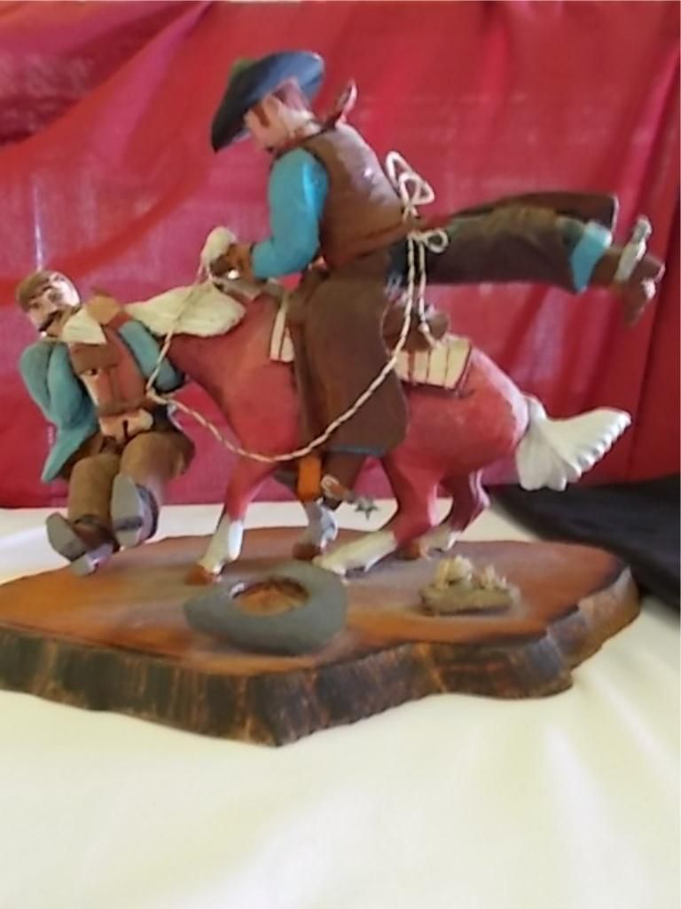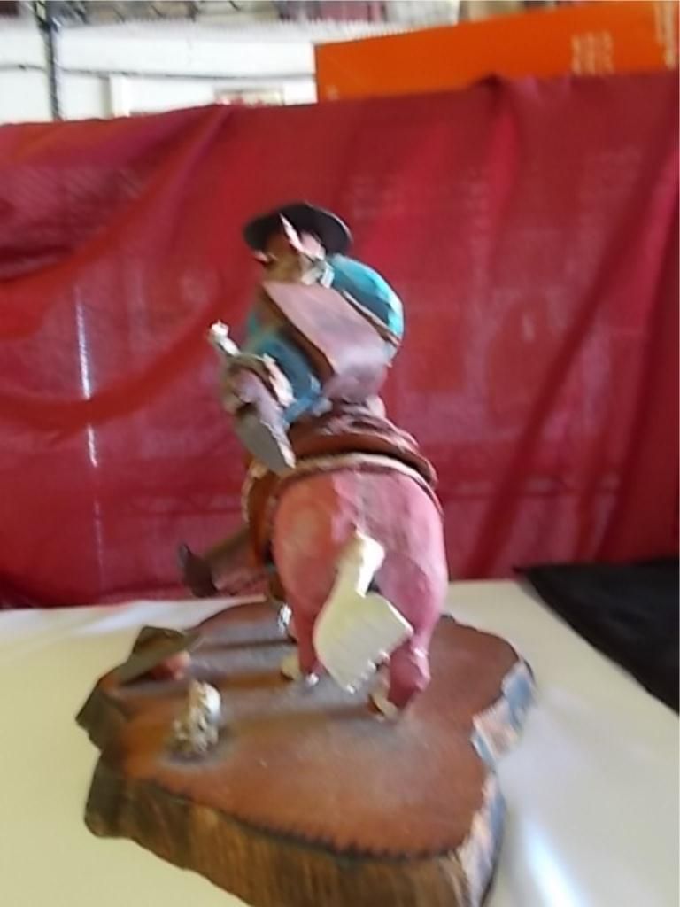 17t – c1973 Hand Carved Wood Rodeo Cowboy Statue – Earin’ and Forkin’ . 14 ½” wide, 10 ½” deep and 10/1/2” tall. Carved by a man in Santa Clara, CA. Artist, carver, hermit and hoarder all rolled into one. Colorful, detailed and definitely a conversation piece.