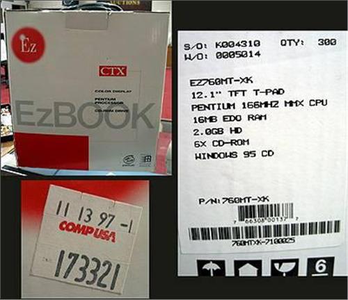 c1997 EZ BOOK Laptop in case. Pentium 166MHz MMX CPU. 16MB EDO RAM, 2.0GB HD 6x CD rom loaded with Windows 95. As is in original box and packing