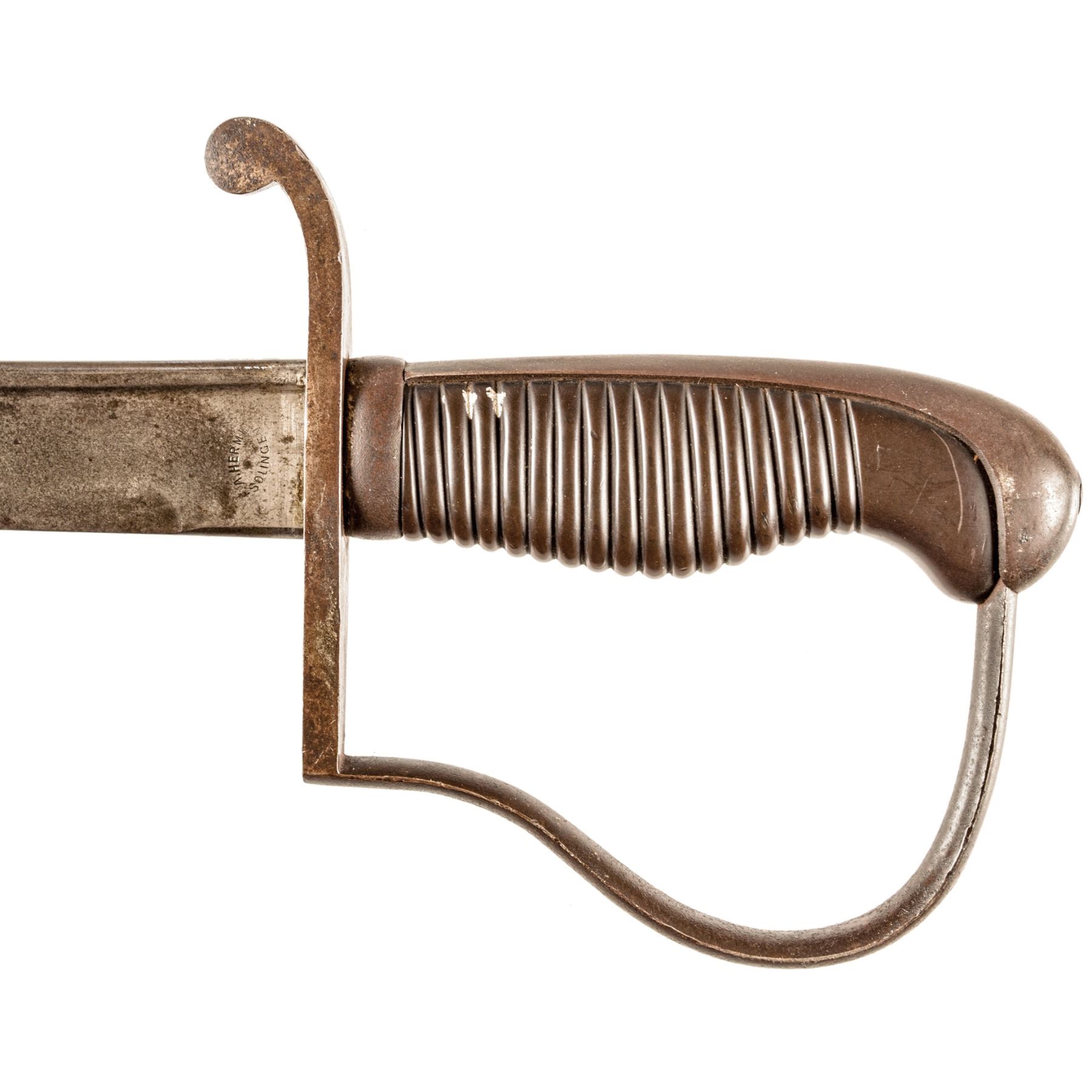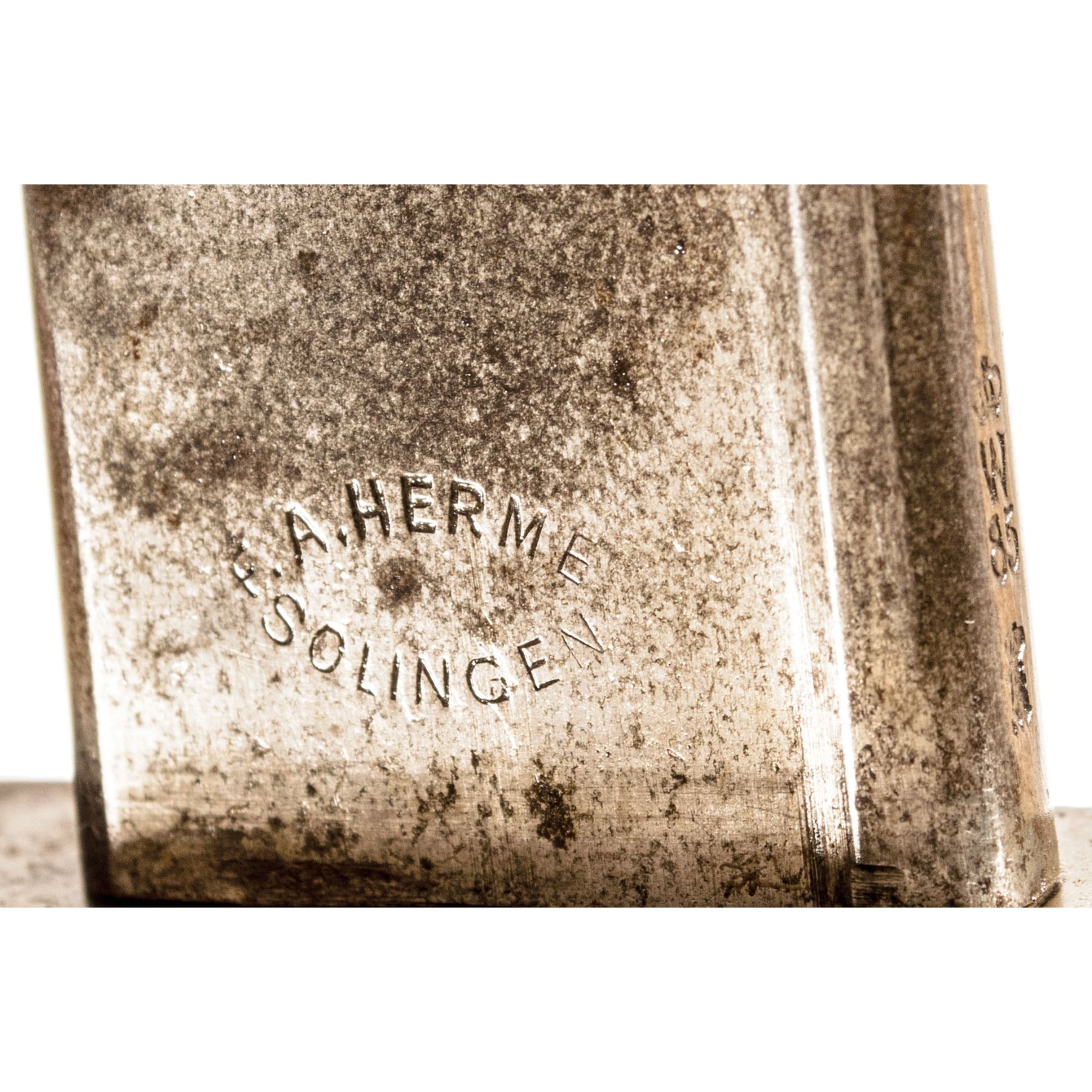 This Prussian / German Military Cavalry Sword has a 34.25" slightly curved single edge, pipe back with an approximate 13" double-edge spear point to the tip of the blade. The blade has some very minor areas of light pitting and staining. The ricasso is marked, "F. A. HERME, SOLINGEN" and has military inspectors mark a "CROWN" over "W" over "85". The steel hilt / guard is very similar to the English Pattern 1796 (copied by other countries and used up through World War I). Hard rubber grip. The original steel scabbard has been cleaned and has some dents. Overall a nice sword.