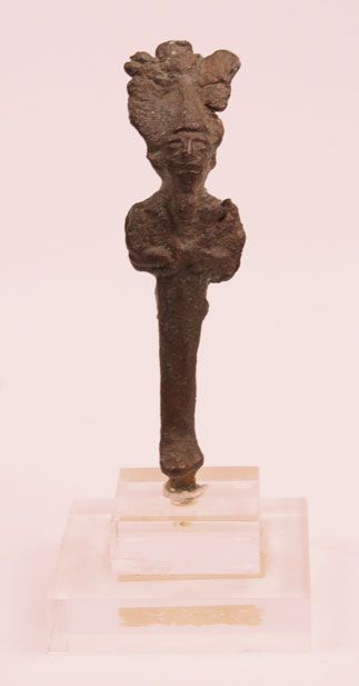 Bronze figure of Osiris, Egyptian god of the afterlife. Standing with hands holding a flail and crook and wearing Atef crown.