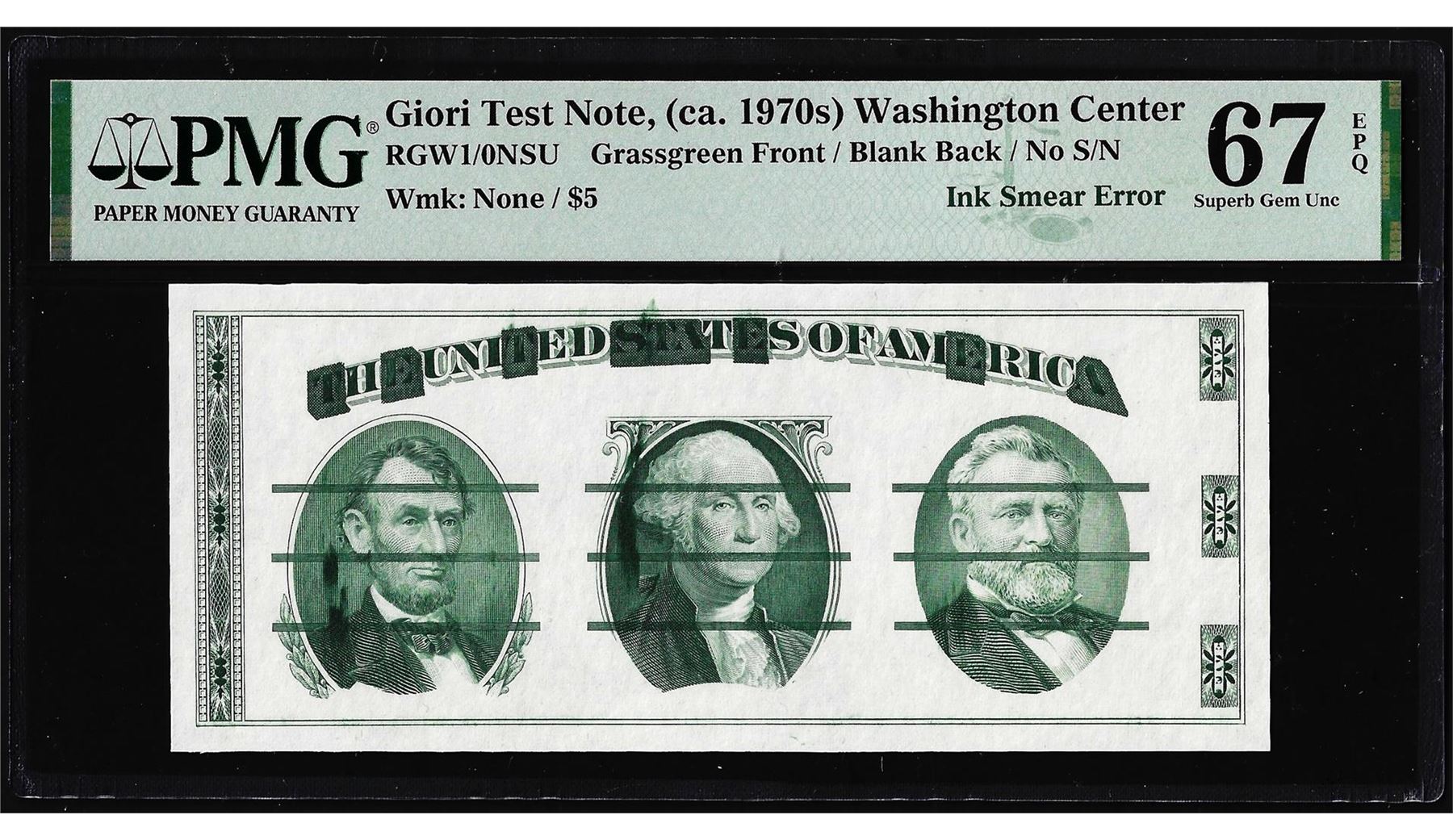 ca. 1970's Washington Center Giori Test Ink Smear Error Note PMG Superb Gem Unc. 67EPQ
