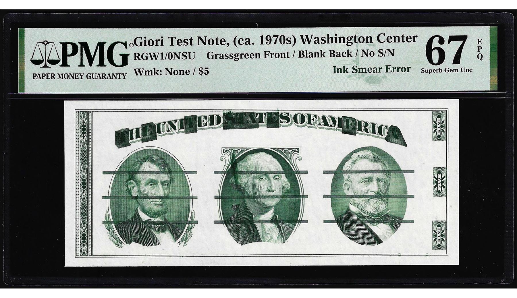 ca. 1970's Washington Center Giori Test Ink Smear Error Note PMG Superb Gem Unc. 67EPQ