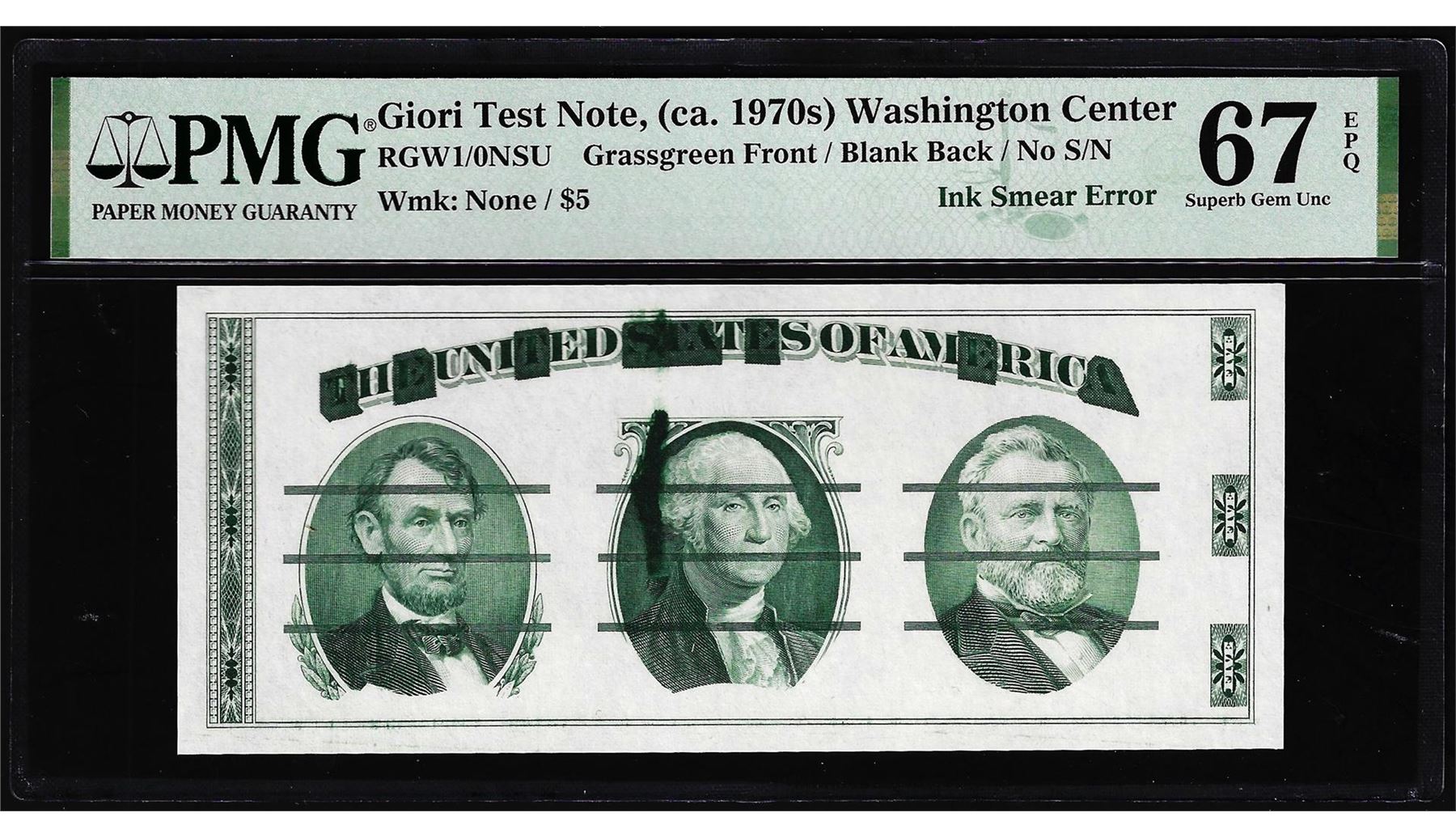 ca. 1970's Washington Center Giori Test Ink Smear Error Note PMG Superb Gem Unc. 67EPQ