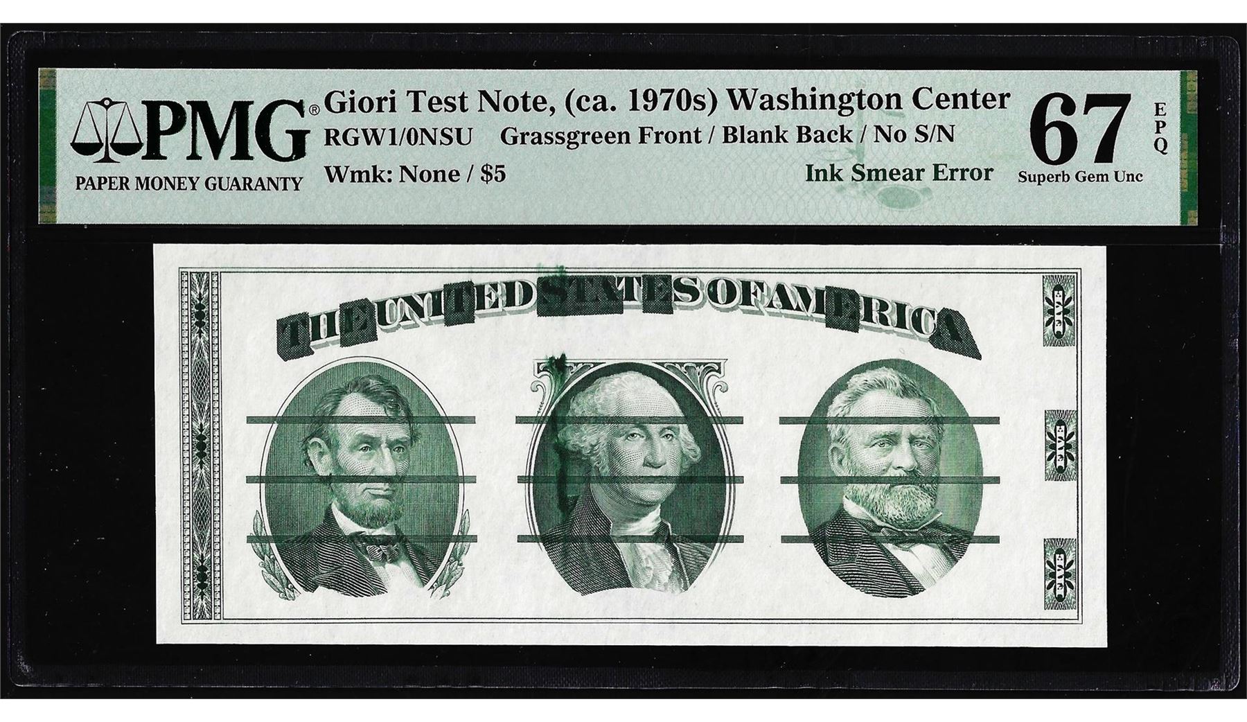 ca. 1970's Washington Center Giori Test Ink Smear Error Note PMG Superb Gem Unc. 67EPQ