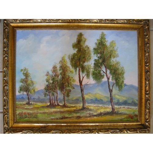 This delightful California Landscape painting is magnificent!. it is decorative yet collectible. the frame is beautiful and accented this wanderful and striking painting. it is signed with a red paint. what a wonderful accent for the living room of a fine home. the gold inlay of the frame is very nice. the painting is in excellent condition with normal wear and tear. no scratch or chip or anything. it measures 18 inches tall and 24 inches wide.