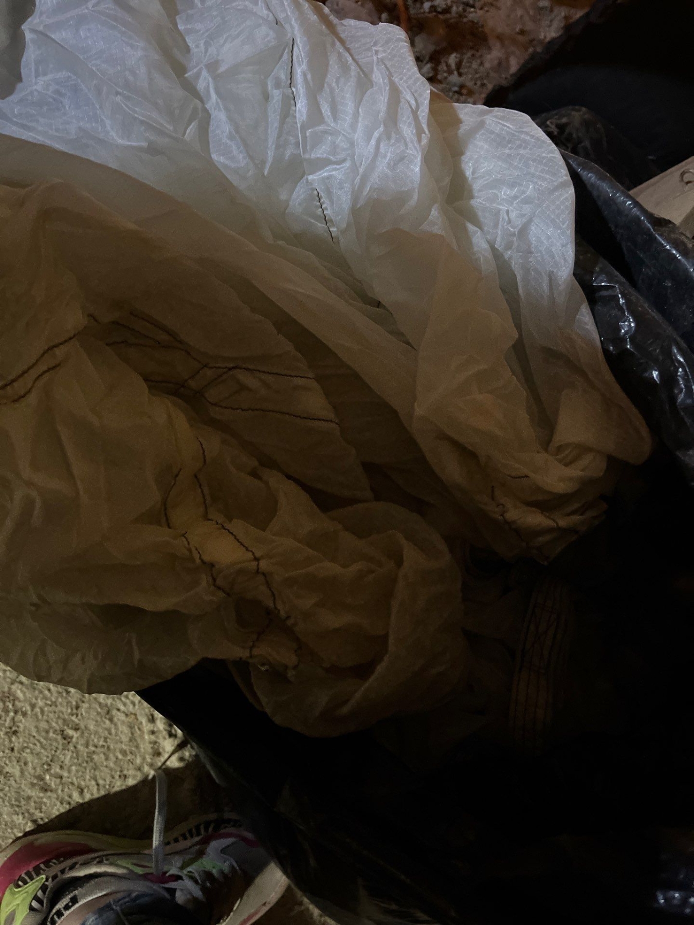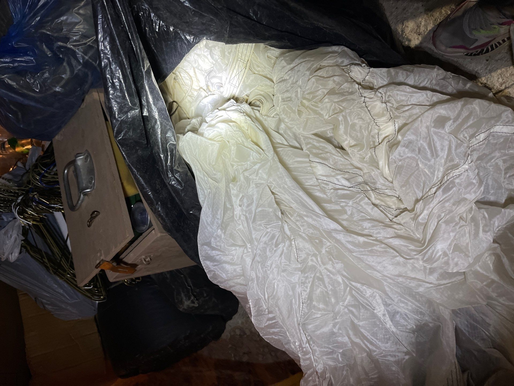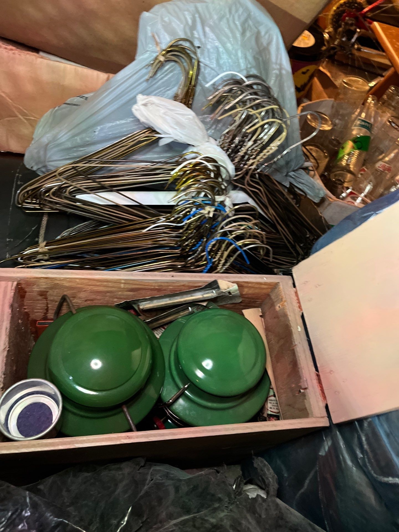 camping gear. Padded insulated bedding, 2 Colman lanterns, heavy blankets and a parachute and metal coat hangers