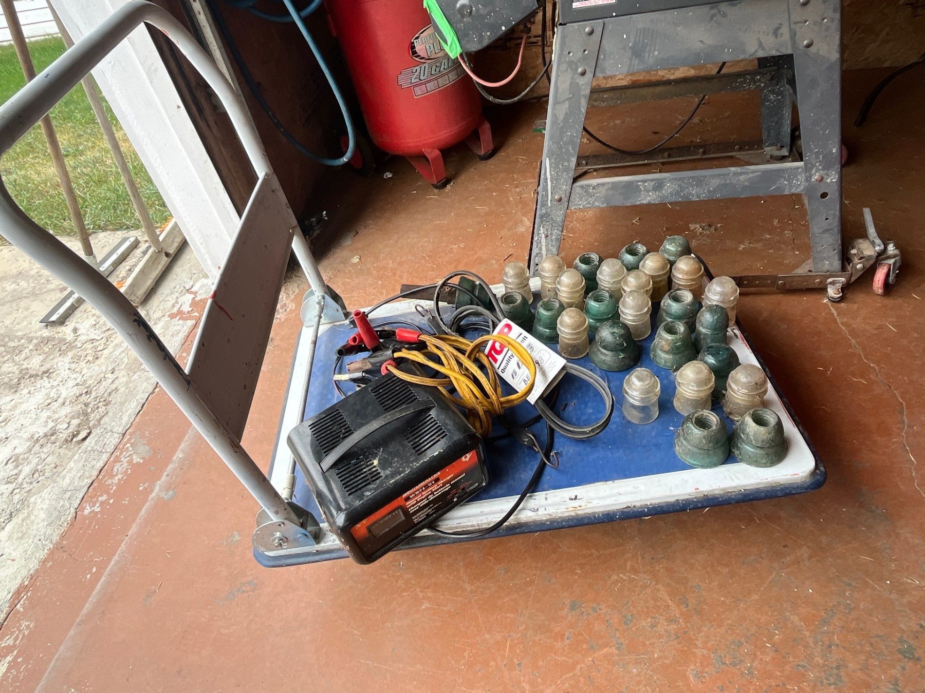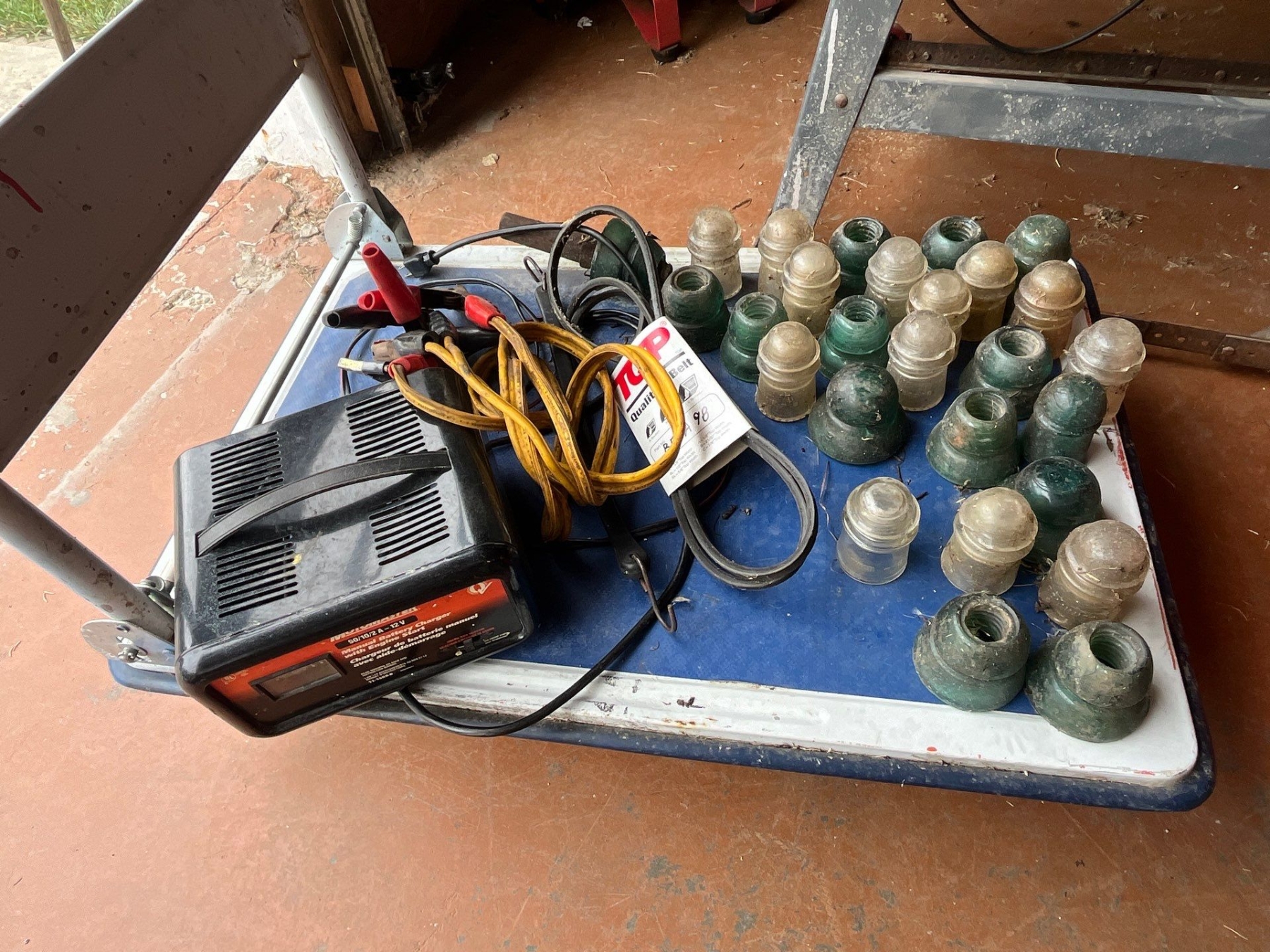 cart with battery charger and jumper cables with a selection of antique power line insulators .